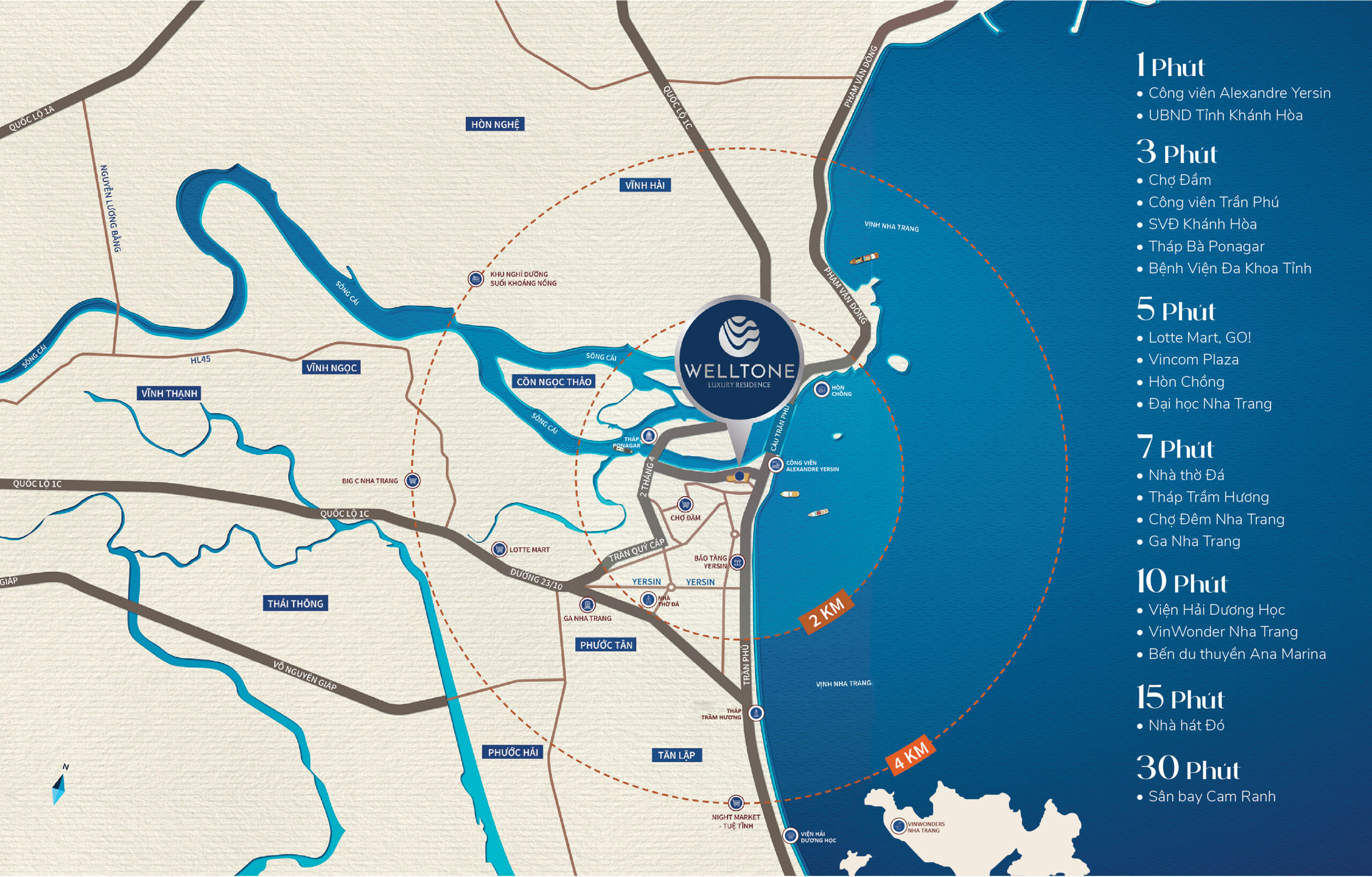 Welltone Luxury Residence kiêu hãnh hiện diện trên “cung đường tỷ đô” Trần Phú – trục huyết mạch danh giá bậc nhất của Nha Trang, nơi hội tụ vị thế “kim cương” hiếm có cùng giá trị đẳng cấp vượt thời gian. Dự án tọa lạc tại điểm giao thoa đặc biệt, nơi dòng chảy thịnh vượng của Sông Cái gặp gỡ vẻ đẹp tinh túy của Vịnh Nha Trang, kiến tạo nên chuẩn mực sống “kế sông – cận biển” giàu sinh khí, bền vững giá trị và mang đậm dấu ấn di sản. Từ Welltone có thể dễ dàng di chuyển đến:
